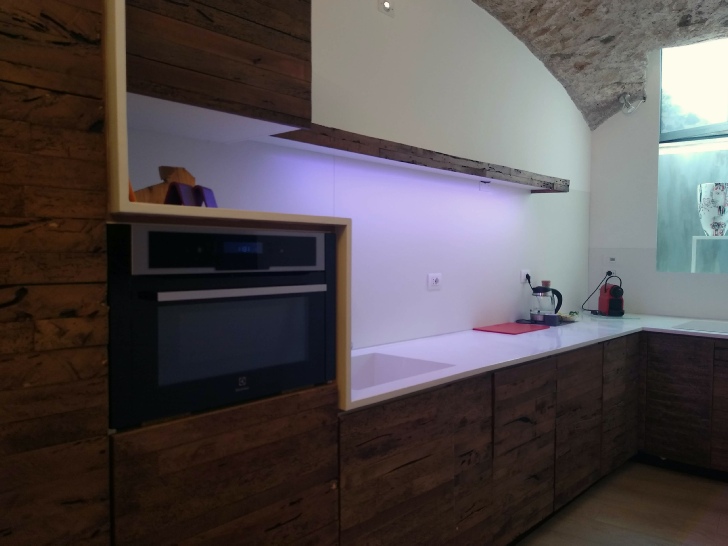 A contemporary all “hand made” walnut wood plated kitchen fully equipped with on demand colourful LED lighting inside a Medieval cellar.
